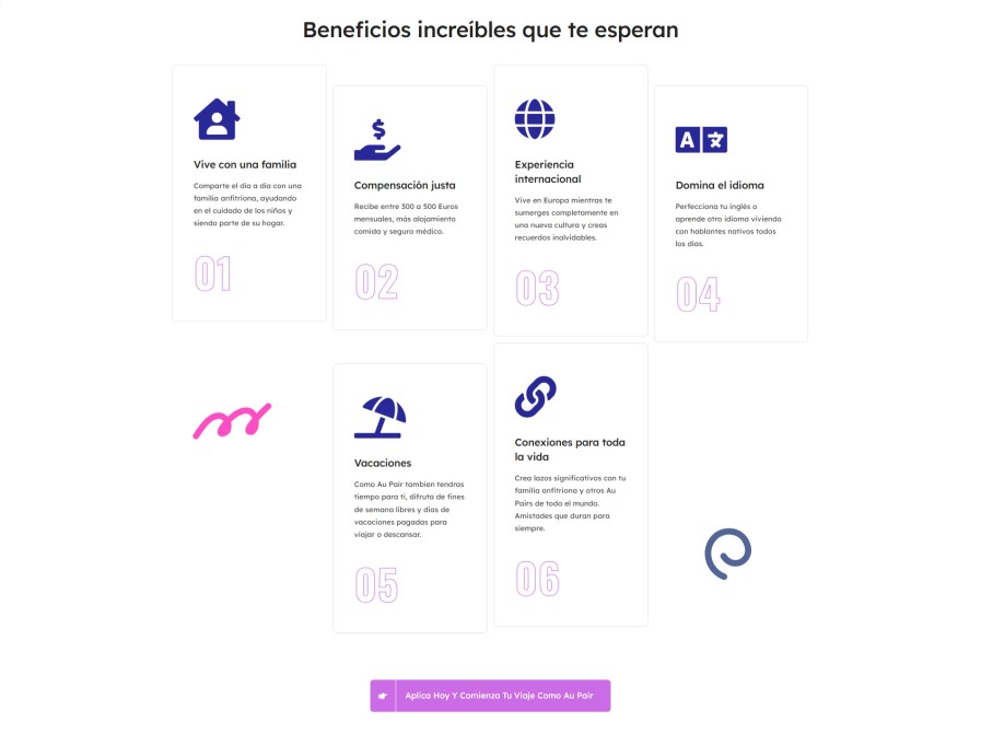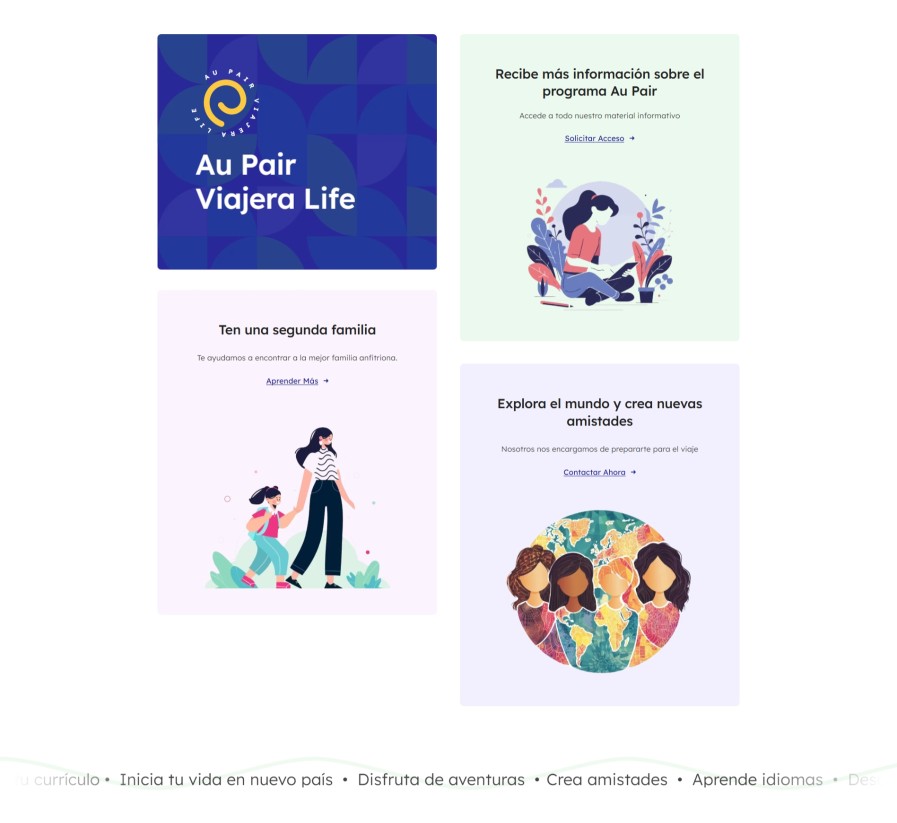 La web está construida para guiar al usuario paso a paso. Desde el primer bloque se comunica de forma directa la propuesta de valor: vivir una experiencia internacional como Au Pair, con acompañamiento y preparación previa.
