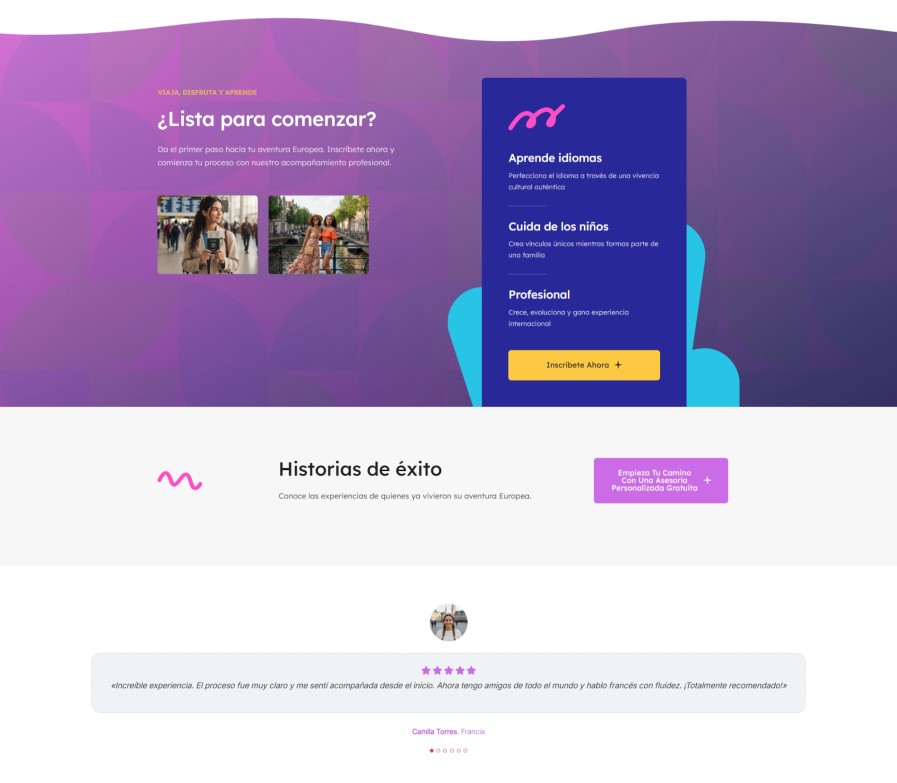 Para conseguirlo, trabajamos una estética visual fresca, con colores vivos, elementos gráficos suaves, fotografías aspiracionales y una estructura muy fácil de recorrer. La página no debía parecer una web fría o institucional, sino una experiencia cercana que conectara con el tipo de persona que está imaginando su primer gran viaje al extranjero.