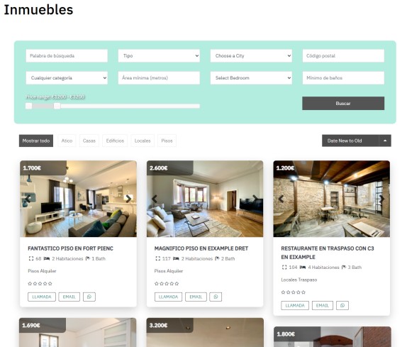 Un buen sistema de filtros es fundamental cuando la web contiene un número elevado de inmuebles. Cada elemento del listado (propiedad) tiene incorporados dos botones que facilitan el contacto directo con el agente ya desde la propia lista. Uno de esos botones es el de llamada y otro el de whatsapp, el cual abre directamente un chat con el agente o dueño de la propiedad.